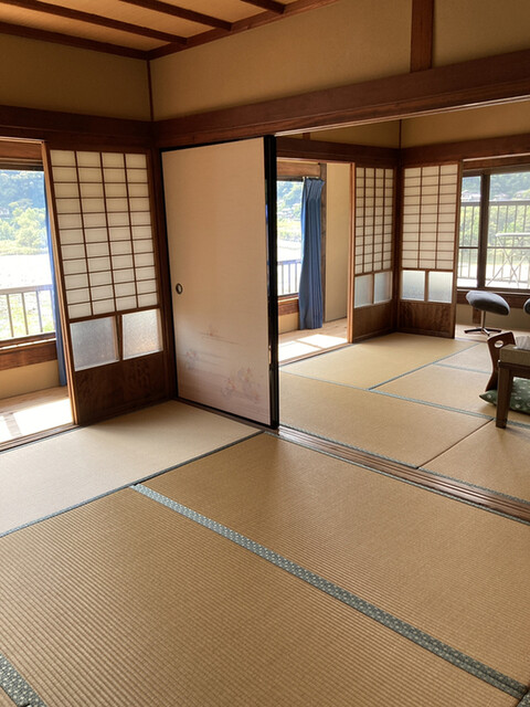 最寄駅の江川崎から路線バスで40分ほど揺られ、宿に着くと、スキンヘッドのおっちゃんが出迎えてくれた。1人客だったのに、2階の二間続きの大きな和室へ案内してくれた。テラスからは四万十川と沈下橋が見下ろせる。最高じゃないか。