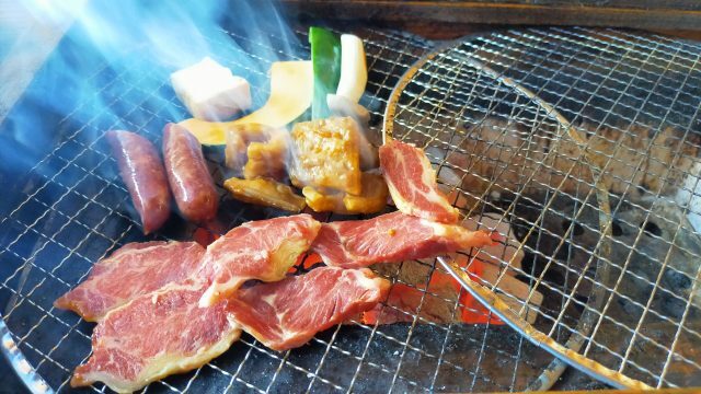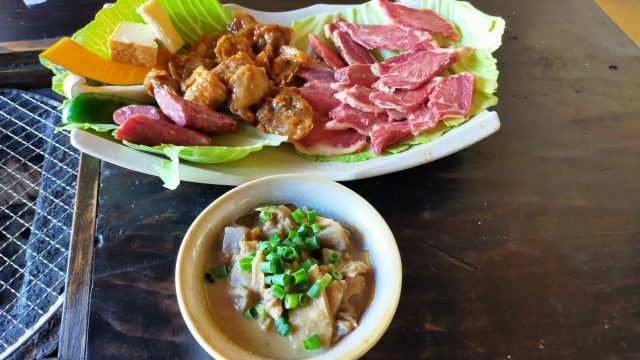 馬焼セット馬モモ・馬ホルモン・馬ソーセージ・馬ホルモン煮込み・馬汁・おにぎり・キムチ・野菜