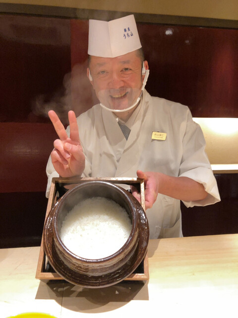 【ご飯】土鍋でじっくりと炊き上げられた白米は艶々甘く、まずは少量をお味見させてくれます。