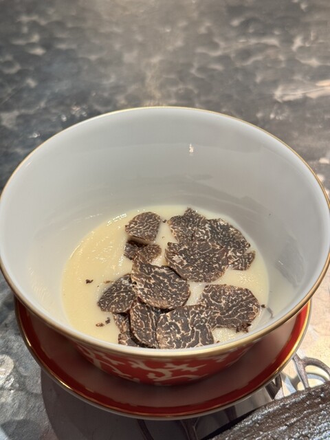 始まりの一品は濃厚な香り高いコンソメスープと渡り蟹の内子を合わせたもの。最初から驚きがありました。