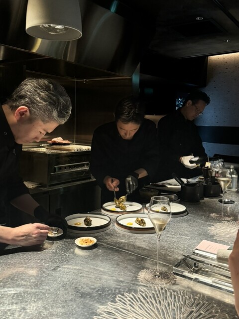 お店は黒を基調としたカウンターで大人の雰囲気です。オープンキッチンになっており、美しい終始調理風景を見ることができました。
