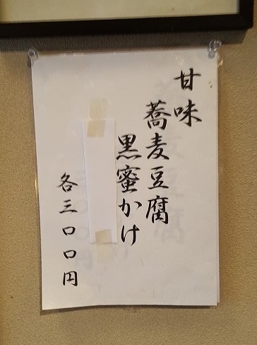 壁に蕎麦豆腐黒蜜かけというメニューが貼ってあった。