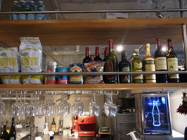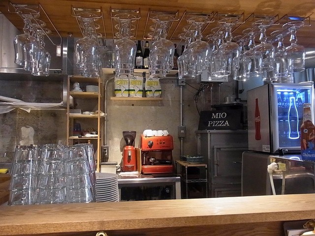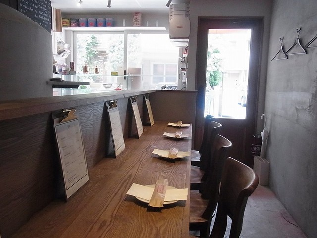 入ると、右にピザ窯のある厨房があり、その前が6席のカウンター。