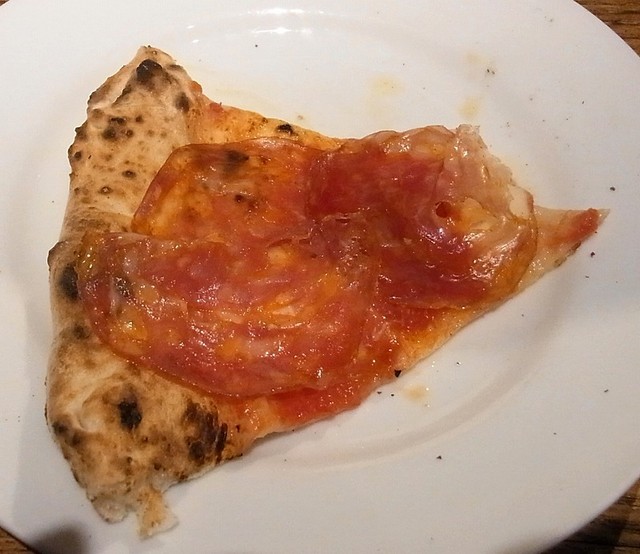 説明には、トマトソース、モッツアレラ、辛いナポリサラミ、黒こしょうと書いてある。