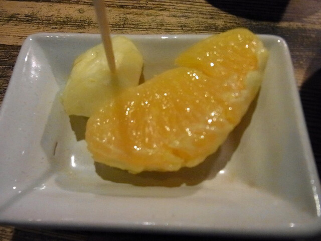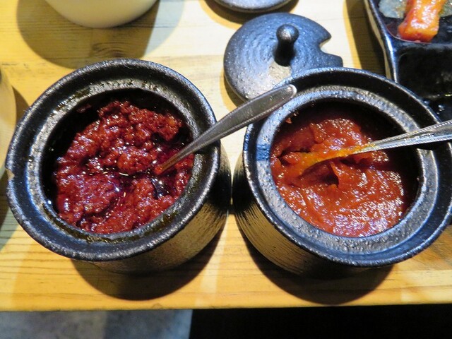 タレはあらかじめついているが、テーブルにあるタレを小皿に入れ、用意されている辛味調味料2種類を付けて食べる。