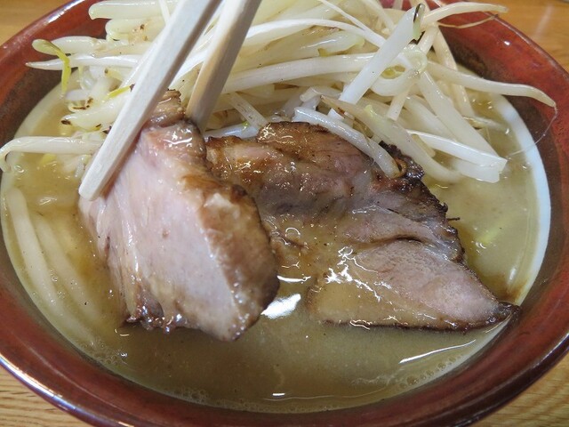 見た目はモヤシなどの野菜が半分、2枚のチャーシューが半分を占めている。