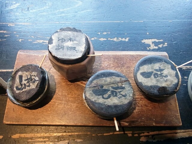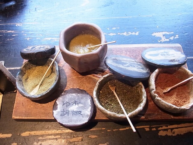 広めのテーブルの上に山椒・ゆず胡椒・七味・一味の4種の薬味の容器が置かれている。
