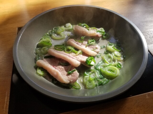 肉厚な鴨肉が4枚盛られ、たっぷりの葱と味わい深いだし汁と共にさっと加熱していただきます。