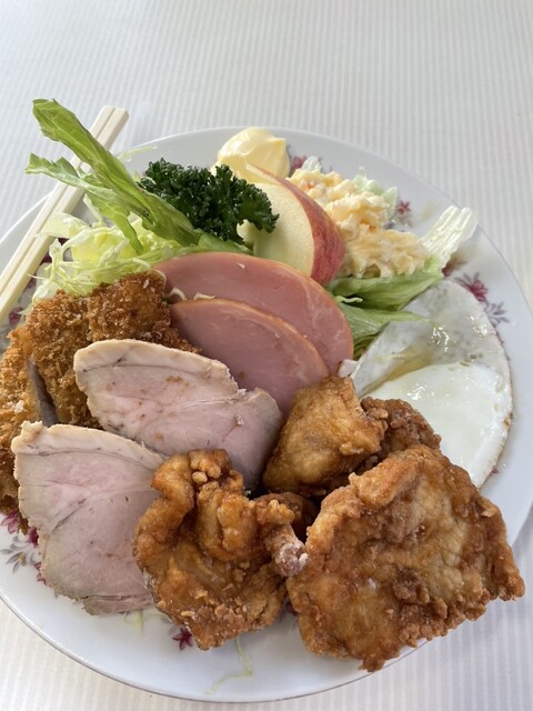 唐揚げ 一口カツ(十分ボリュームあるロースカツ) 焼豚 千切りキャベツとレタスのサラダ