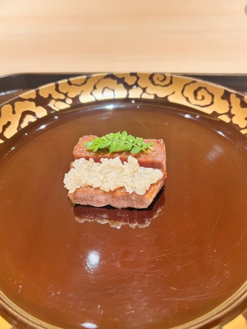 万葉牛のリブロースの巻き&かぶりの部分を使い淡路島の由良の紫ウニを乗せたユッケ!