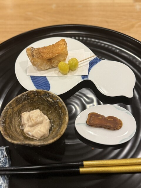甘鯛の竜田揚げ、銀杏、柿の白和え、カラスミ