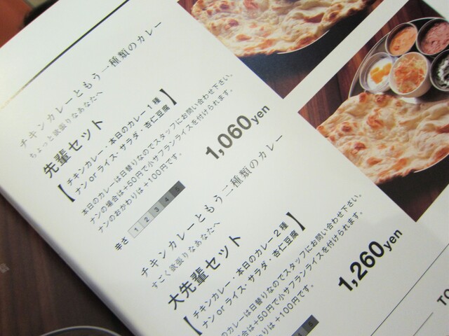 これ(キッズカレー)とこれ(シーフード)をライスで辛さ1番、それにこれ(マトンカレー)をライスで辛さ3番。そして「チキンティッカ」をお願いします。