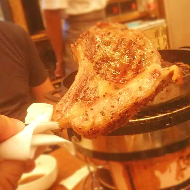 まず野菜を焼き、その水分で蒸し焼き風に焼き上げる(店員さん談)そうだ。肉は臭みがなく、肉より、焦げた肉汁を吸い込んだ野菜が最高にうまい。焼き肉屋さんの甘ったるいそれとはまた一味違うタレがうまい!!翌日休みの私は遠慮なくニンニク・イン!さらにダブルで!!そして一味(?)唐辛子をパラパラ。よしっ!旨さ倍増ぉーーー!!育ち盛り食べ盛りをとうに過ぎた40代のおじさん3人組のテーブルとは思えない秒殺ぶりで肉と野菜が消える!3人のおじさんではなく私一人の仕業かもしれないことにはあえて触れずに。。。そして、ラムチョップとラムソーセージが登場。ラムチョップは厚みがあるので焼けるまで時間が、逆にソーセージはすぐ食べれる。ソーセージ旨っ!秒殺どころか瞬殺でなくなる。ラムチョップが焼けるまでひと時も目も離せない程注視。焼けた!塩コショウで味が付いてるのでそのまま骨を持ってギャートルズ肉のようにかぶりつく。うまい!旨い!!ウマーイ!!!