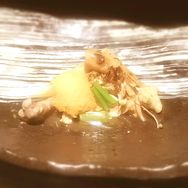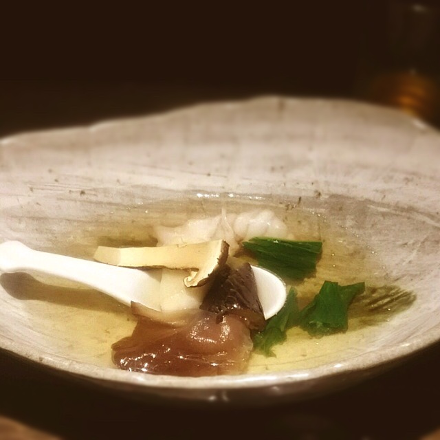 続いて石鯛と松茸を出汁を張った器に。これは土瓶に入っていない土瓶蒸しのような料理だ蒸し物と取るべきか?汁物と取るべきか??旨いけどちょっと味が薄く、時期が遅めな松茸は(今年の作柄も良くないせいか?)それほど香りも良くない。もちろん3000円のコースだからいい松茸なんて期待しちゃだめだよね、、、