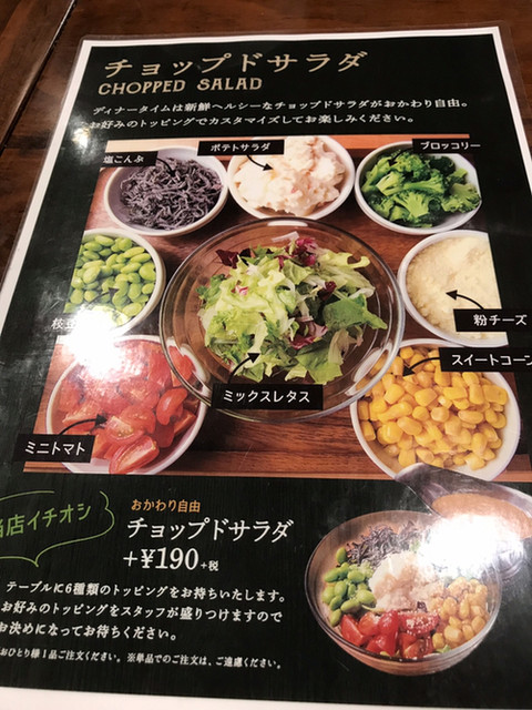 まずはサラダから、190円だからと半信半疑だったけど大きなボウルに盛られたサラダに店員さんが好みのトッピングを載せてくれる。『嫌いなトッピングはありますか?』いいえ、嫌いな物はありません、なので最初は全部を載せてもらう。『塩昆布と粉チーズで何も書けなくても味が付いています。お好みでドレッシングをお使いください』