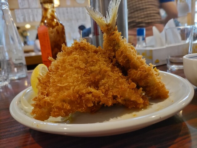 中濃ソースをかけ、レモンを搾り、自宅では使わない、洋ガラシをちょいちょいとつけて、ぱくり。