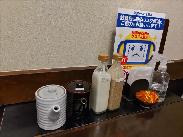卓上。甘口ソースと辛口ソース。しそドレッシングと胡麻ドレッシング、辛子が備わる。