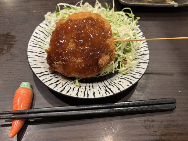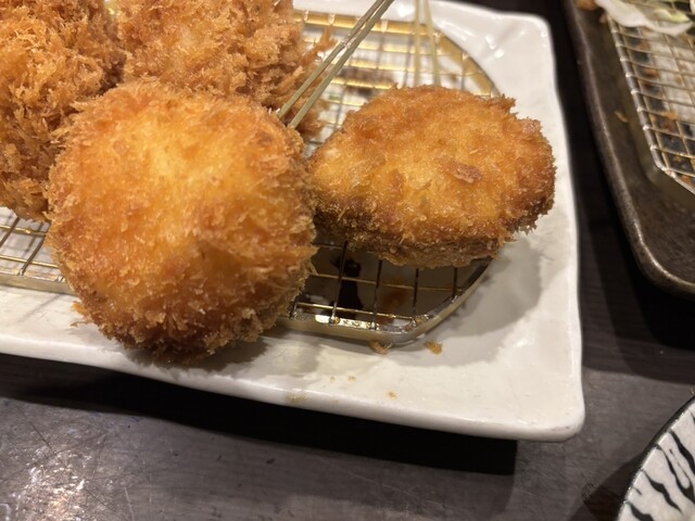 ずわいがにクリームコロッケ(奥)、串揚げ〜玉ねぎ(手前)
