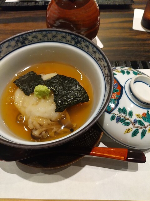 本日のお椀は枝豆のしんじょ。夏なのであっさり目のお出汁でいただく。お出汁には糸モズクがカ