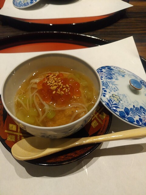 つづいてお楽しみの椀。目にも鮮やかなな緑を使ったビジュアル。そしてほれぼれするお出汁。い