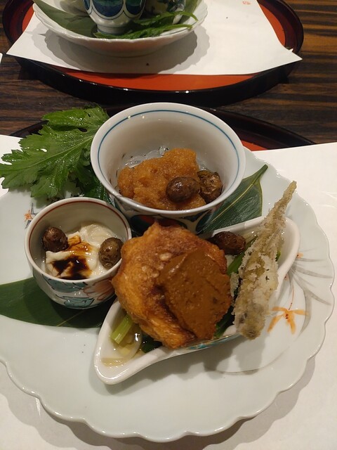 先付けは鯛の白子豆腐。上に乗せた山菜ともみじおろしが味を引き立てる。ほのかに白子の風味が