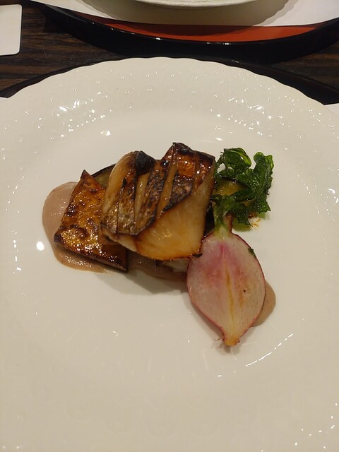 焼物:ぶり、白子と春菊のソース