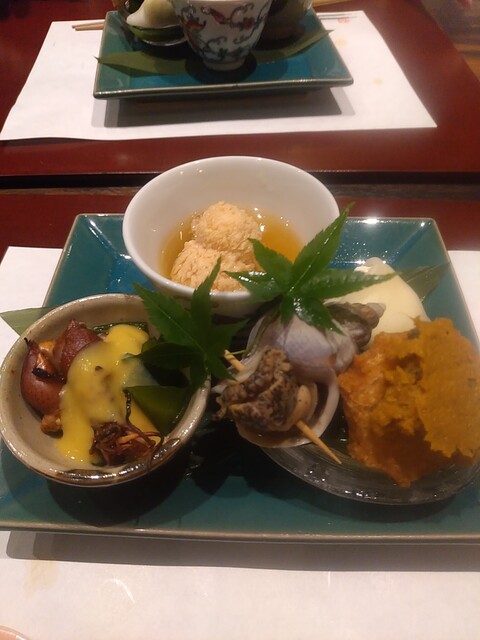 八寸:左上から白子、牡蠣、ほうれん草のお浸し、生ハム、レバーペースト、ピーマンの酢漬け