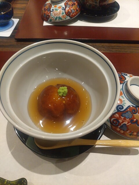 その後海老芋のあんかけ。私はこういうお料理が大好きなのでうれしい。お出汁と生姜が効いたあ