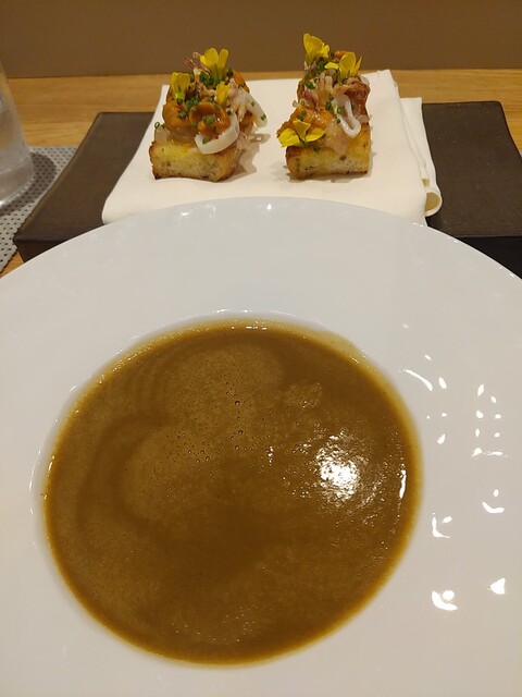 て面白い。もう一品は鮟鱇の肝を使ったカナッペ。土台の甘みがあん肝と不思議にマッチする。