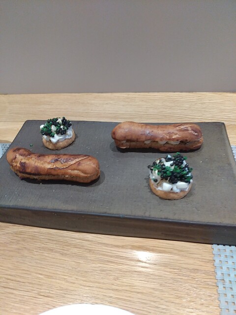 椎茸、長ネギ、卵黄のエクレ仕立て、あん肝と焦がし葱のカナッペ