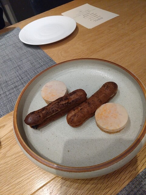 お料理は名物のアミューズから。本日のエクレアは椎茸と長ネギと卵黄。いろいろと複雑な味がし