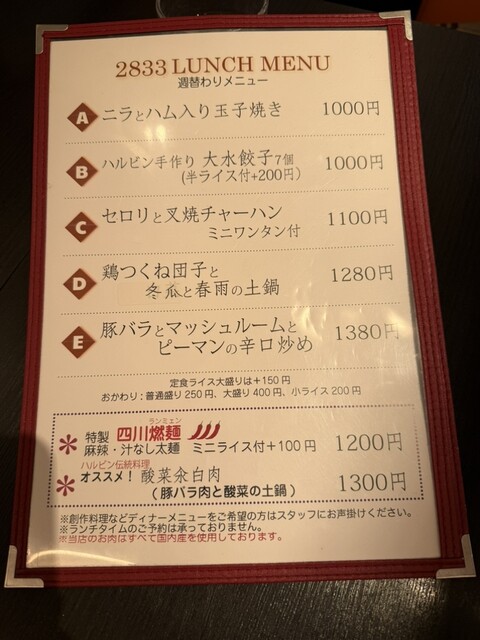 ・同じようなメニューの1833と2833だが、子供は中華で必ず油淋鶏を食べたがるので、我々としては2833がのほうがよい。2833の方が駅から遠くてすいてるし居心地もよい気がする。