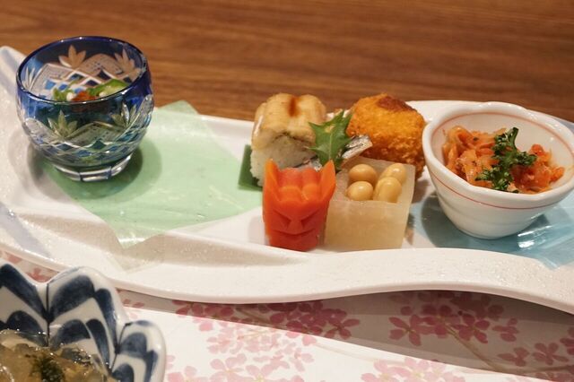 前菜 当地特産金目コロッケ 穴子寿司など5種盛り合わせ