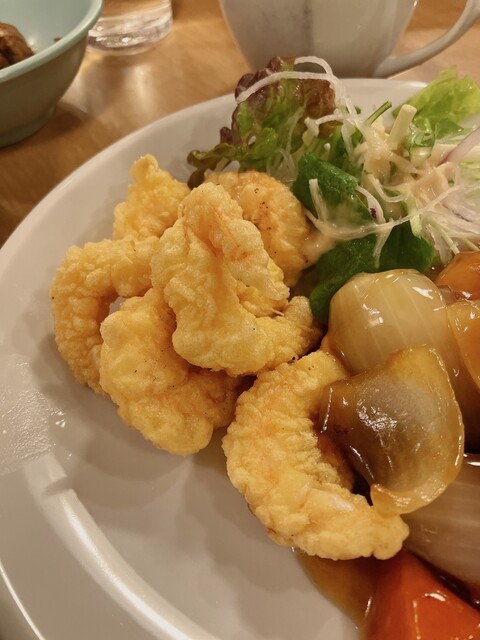 あとは小エビの天ぷらを起点に酢豚→ご飯→ミニスープかムーシーロー→ご飯→ミニスープという流れ。