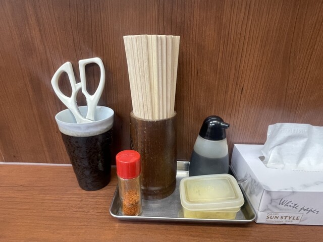 「ダシの原液」の他、卓上には「おろし生姜」「七味唐辛子」が置かれ、味の変化が楽しめ飽きさせません。