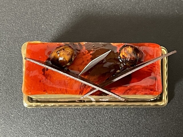 キャラメルムース、ビスキュイショコラ、洋なしのコンポート、ムースショコラ、ノワゼット。