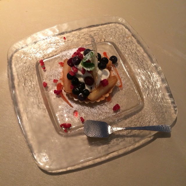 こちらは生ベリーと洋ナシのコンポート。ラングドシャでこじんまりとキレイ。ベリーがルビーみたいでかわいい仕上がり。