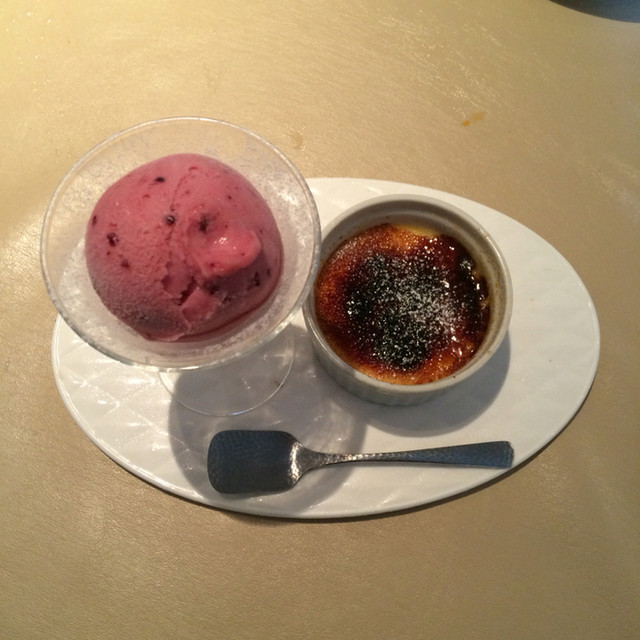 ブルーベリーのソルベと焼きプリン。カラメルがカリカリと炙ってあり、甘酸っぱいベリーの対比が楽しいです、