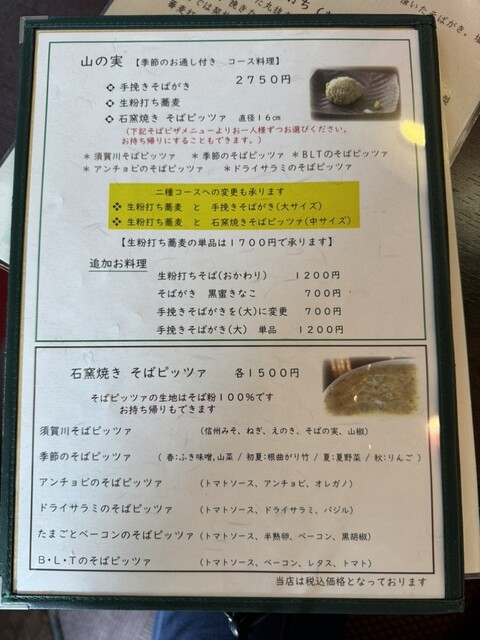 メニューを見ると蕎麦と蕎麦がきと蕎麦ピザのセット?うーん蕎麦づくしか。蕎麦がきにはあんまり良い印象持ってなかったので蕎麦とピザをそれぞれ単品で注文。(食べた後にこのコースの素晴らしさを理解することになる)