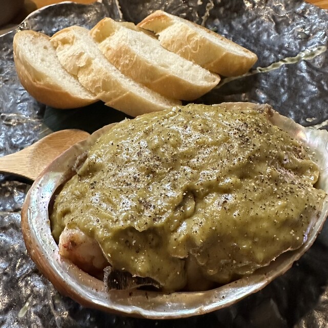 ・鮑の肝焼き(鮑、海老、帆立貝)