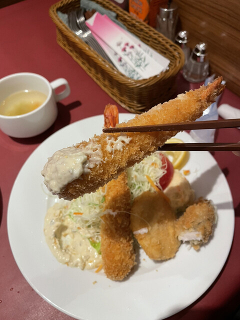 5分ほどして #フライ が運ばれてきました。 #エビフライ はそそり立つ感じでスカイツリー的な塔を彷彿させます。