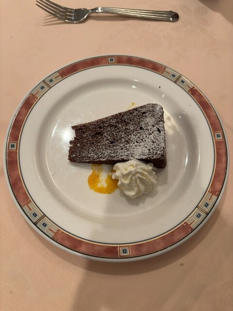 クリームソースもパンで綺麗に拭って余すところなく頂くことが出来ます。その後に出て来たチョコレートケーキは少し硬めで濃厚な味わい。