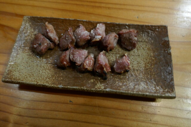 席についてまずビールを注文。最初に出てくるお通しは今回はぬたとモズクと魚の干物の3種でしたが、定番のおいしさ。炭火焼では次のものを注文しました。