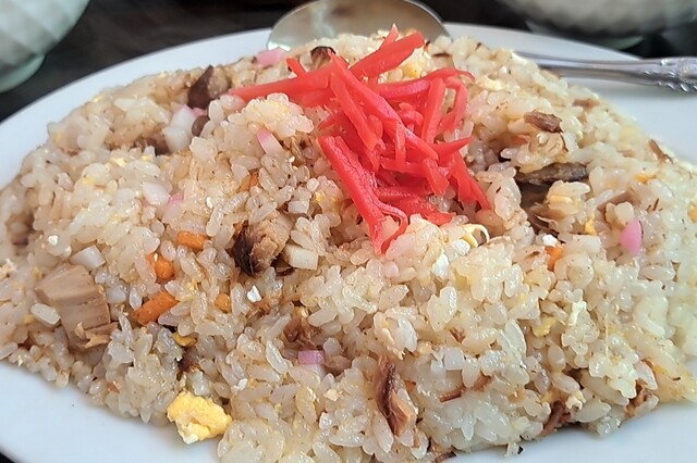 チャーハンにはラーメンスープ玉ねぎ入り脂なし、ミニサラダ(キャベツ、コーン、トマト)