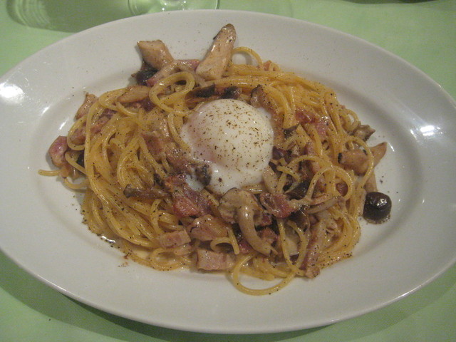 自家製無添加ベーコンときのこクリームソースと温泉卵のせ
