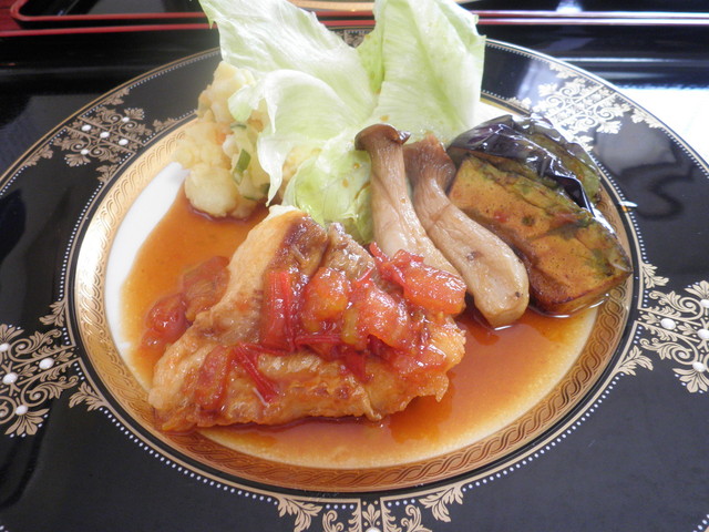 南瓜、ナス、ポテトサラダ、野菜類が添えられ、ドレッシングが鯛と相性が良く美味しかったです。