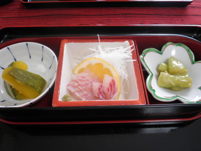 最初の前菜は、鯛のお刺身、南瓜、蓮芋の酢の物の3品です。