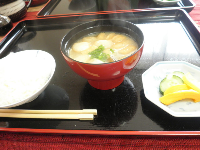 炊き立ての白いご飯は棚田米、具だくさんの味噌汁とお漬物です。