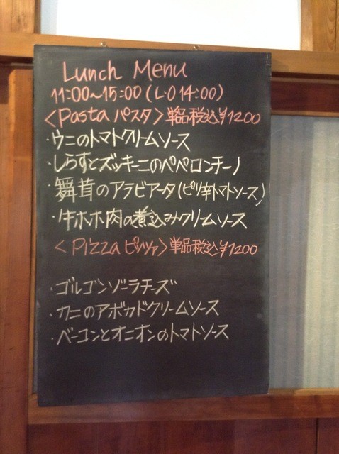 黒板に書かれたメニューに「パスタ4種類」と「ピッツア3種類」がある。