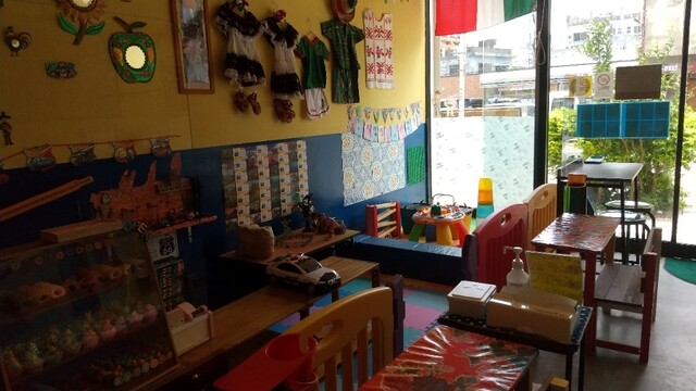 メキシコ料理屋らしい派手な内装で、広めのキッズスペースがある店内。